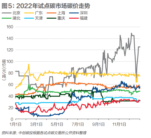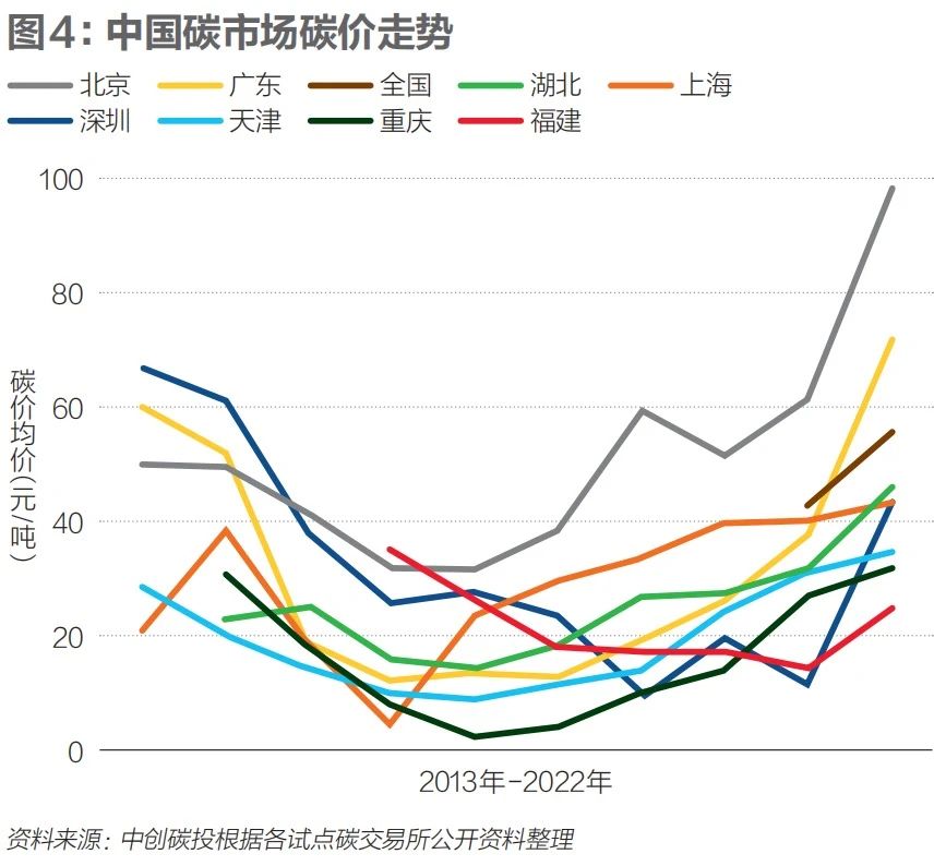 三是北京和广东试点碳市场碳价高于全国碳市场。